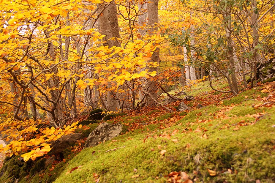Nuestra ruta comienza en el corazón del Parque Natural del Moncayo, en el conocido como Hayedo de Peñaroya que, durante los meses de otoño, nos regala sus mágicos colores y nos invita a caminar entre sus centenarias hayas.