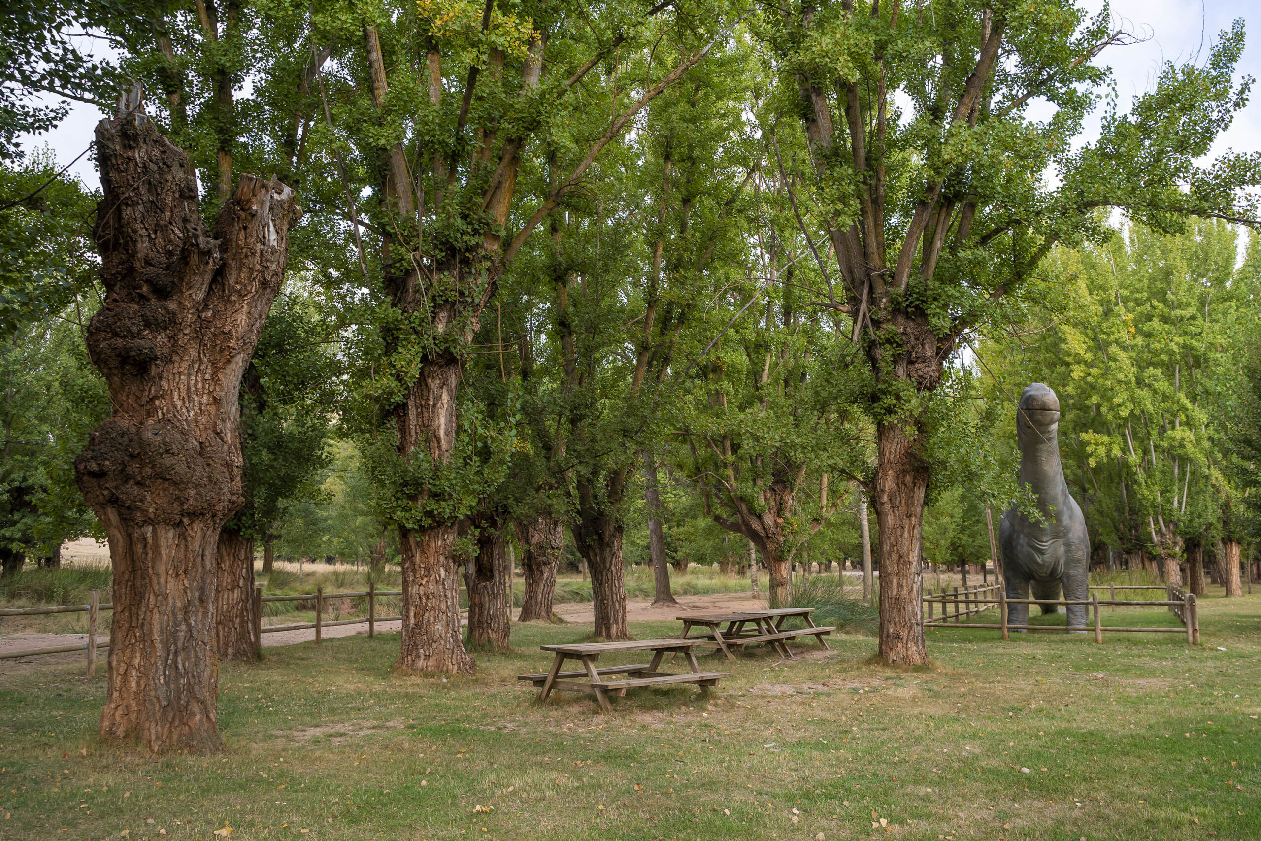La ruta prosigue por la ribera del Alfambra, entre prados y majestuosos chopos cabeceros, hasta alcanzar la Fuente del Piojo, un espacio acondicionado como área de ocio y merendero. En este entorno se levanta la última réplica a escala real del recorrido: un imponente Allosaurus.